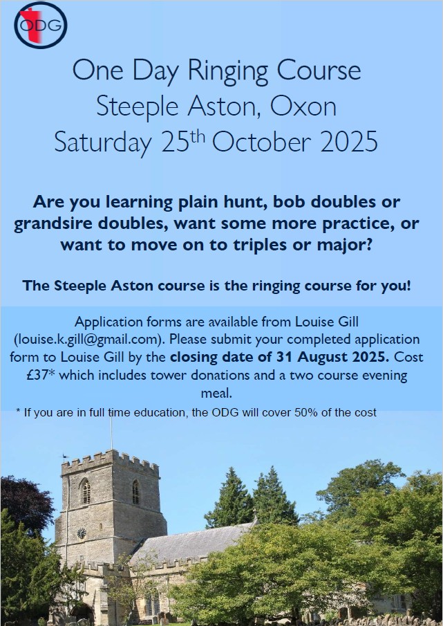 I attach a poster providing details of the ODG’s Steeple Aston Ringing Course to be held on Saturday 25th October 2025.