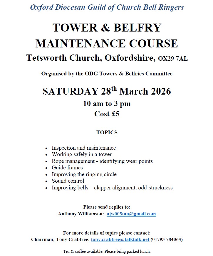 Please see attached poster for our maintenance course – Saturday 28th March, Tetsworth Church, Oxfordshire, OX9 7AL – 10am to 3pm.